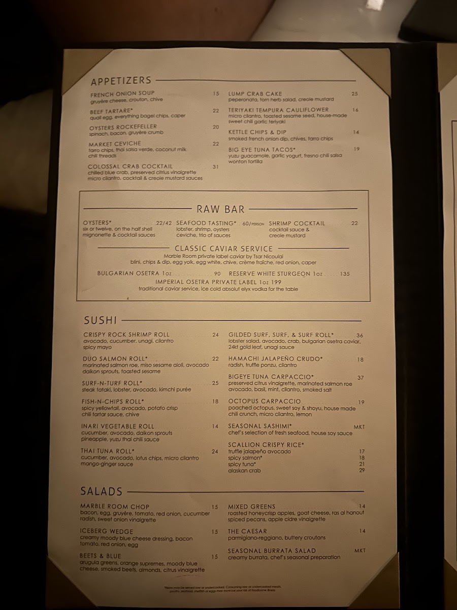 The menu at Marble Room Steaks and Raw Bar offers a diverse selection that spans high-quality steakhouse classics, seafood specialties, sushi options, and a well-curated bar. Guests can explore a variety of savory appetizers, including Beef Tartare, Duck Confit Spring Rolls, and Lump Crab Cake, as well as traditional and contemporary seafood dishes like Oysters on the Half Shell, Oysters Rockefeller, Diver Sea Scallops, and Caviar.