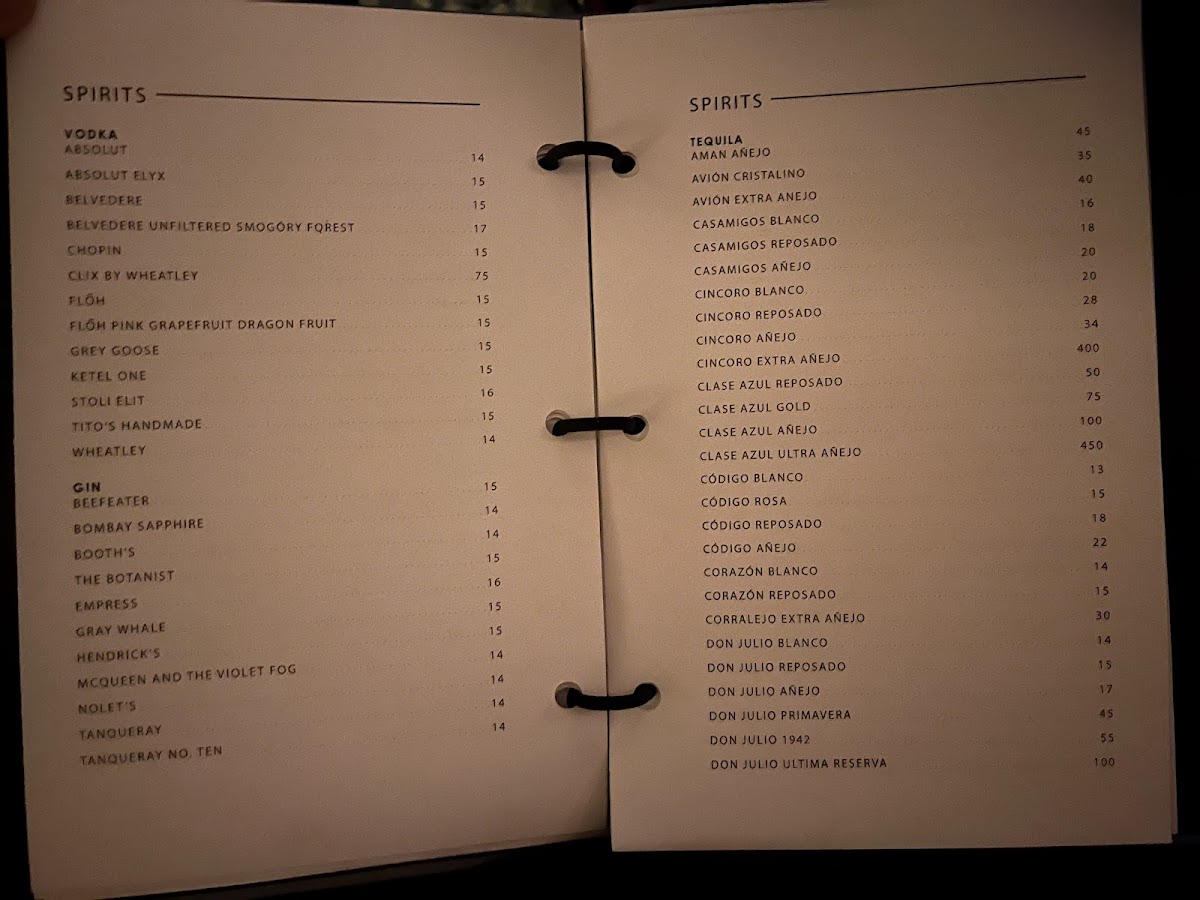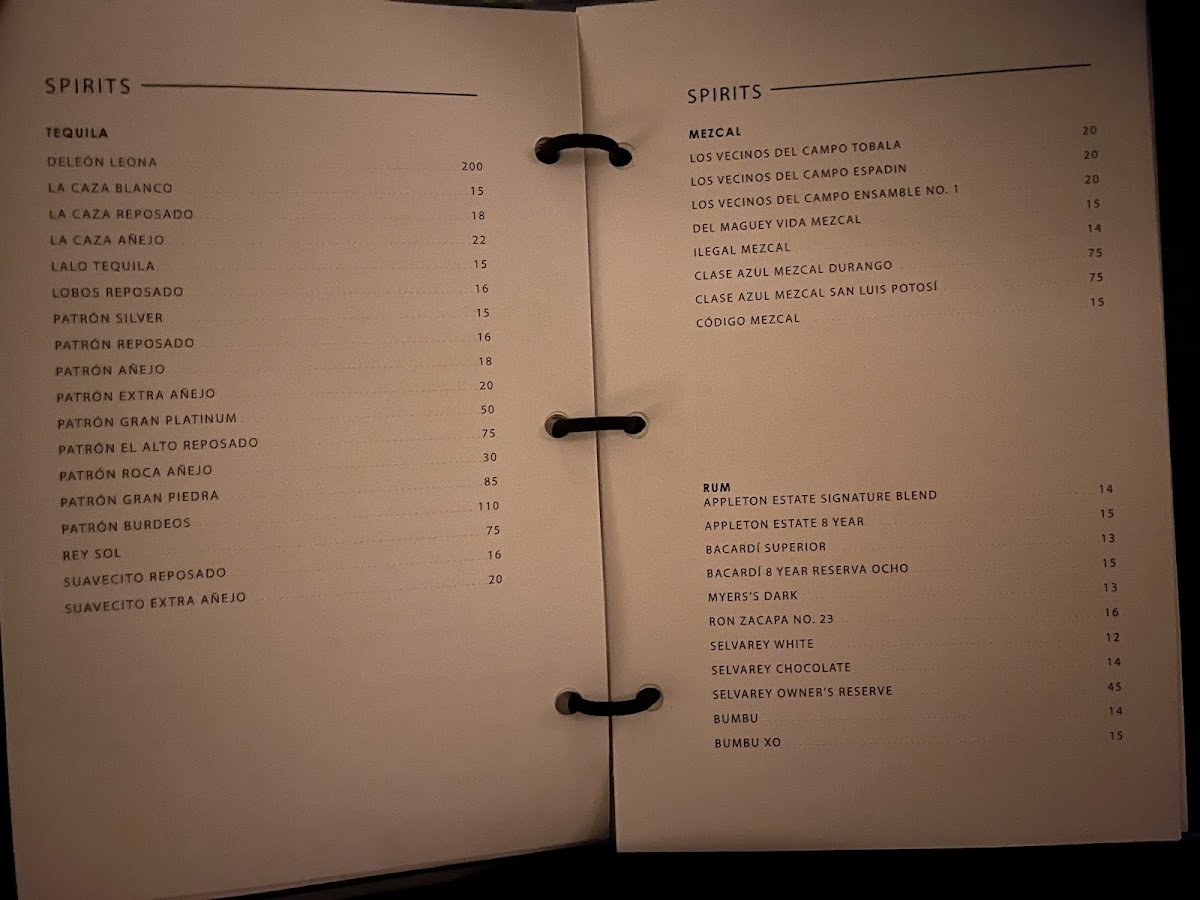 The bar menu presents an extensive liquor offering with a detailed tequila selection ranging from Patron El Alto Reposado to Clase Azul Ultra and Casamigos Anejo. Specialty cocktails are also available, including the Passion Lychee Martini, catering to a wide range of tastes.