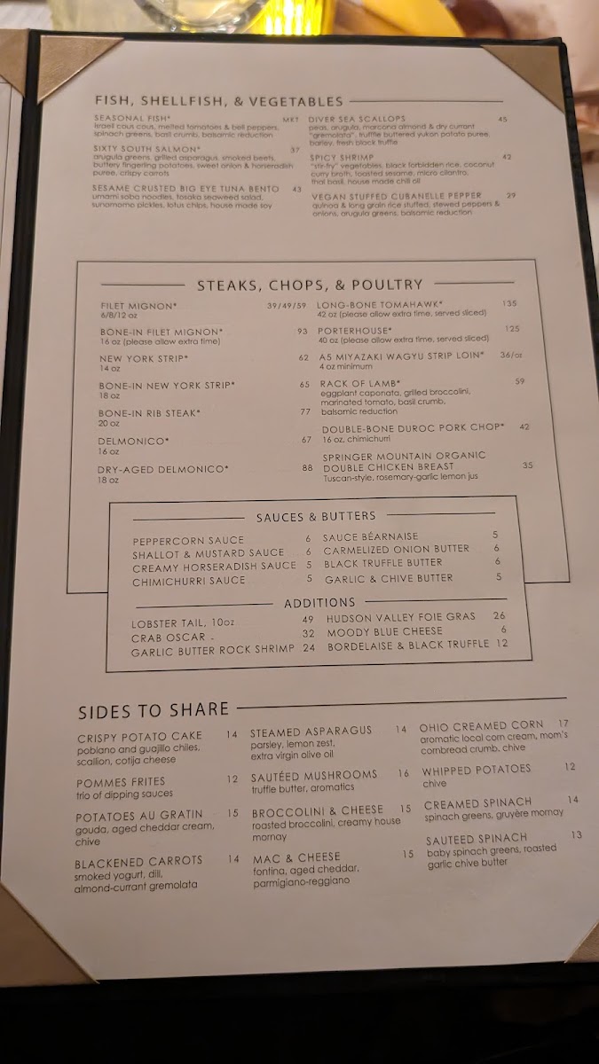 Main courses predominantly feature expertly prepared steaks such as the Dry Aged Delmonico and Delmonico Steak, alongside other protein options including Lamb à La Cart and Surf-N-Turf Roll. Sides like Creamed Spinach, Brussels Sprouts, and Potato Cake complement the entrees. For dessert, the menu includes selections like Marble Room Cheesecake, Flourless Valrhona Dark Chocolate Espresso Torte, and Baked Alaska.